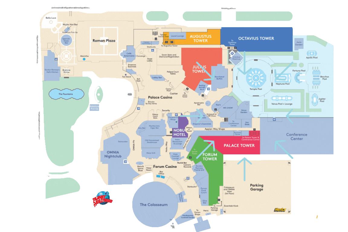 The Venus Gardens is located near the entrances of both the Palace Tower and Julius Tower of the resort. Guests staying off-site can get to the Venus Gardens by entering through the front entrance and going through the Palace Casino.